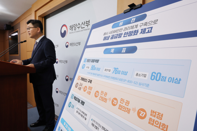 지난 30일 오후 정부세종청사 해수부 기자실에서 해양수산부 최성용 해사안전국장이 해사 사이버 안전 관리 강화방안 관련 브리핑을 하고 있다. 연합뉴스