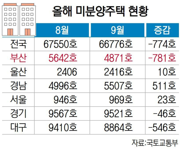 부산의 경우 8월 5652호에서 9월 4871호로, 781호가 감소했다. 그러나 울산은 2406호에서 2416호로 10호가 증가했고 경남은 4996호에서 5507호로 511호가 늘어났다. 미분양 물량이 8월에 9410호에 달하던 대구도 한 달만에 546호가 해소됐다.
