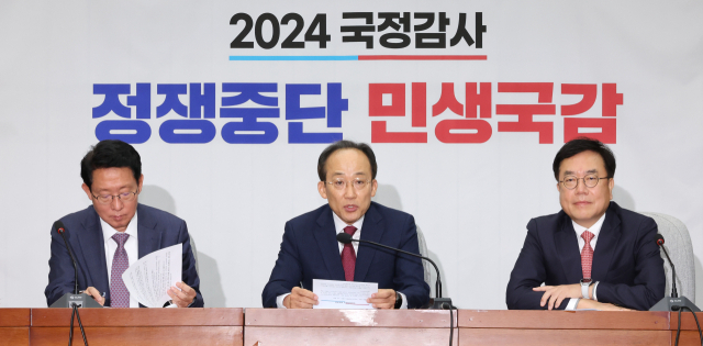 국민의힘 추경호 원내대표(가운데)가 지난 1일 오전 국회에서 열린 국정감사대책회의에서 발언하고 있다. 연합뉴스