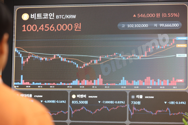 지난달 30일 오후 서울 서초구 빗썸라운지 강남점에 비트코인 등 가상화폐의 실시간 거래 가격이 표시되고 있다. 연합뉴스