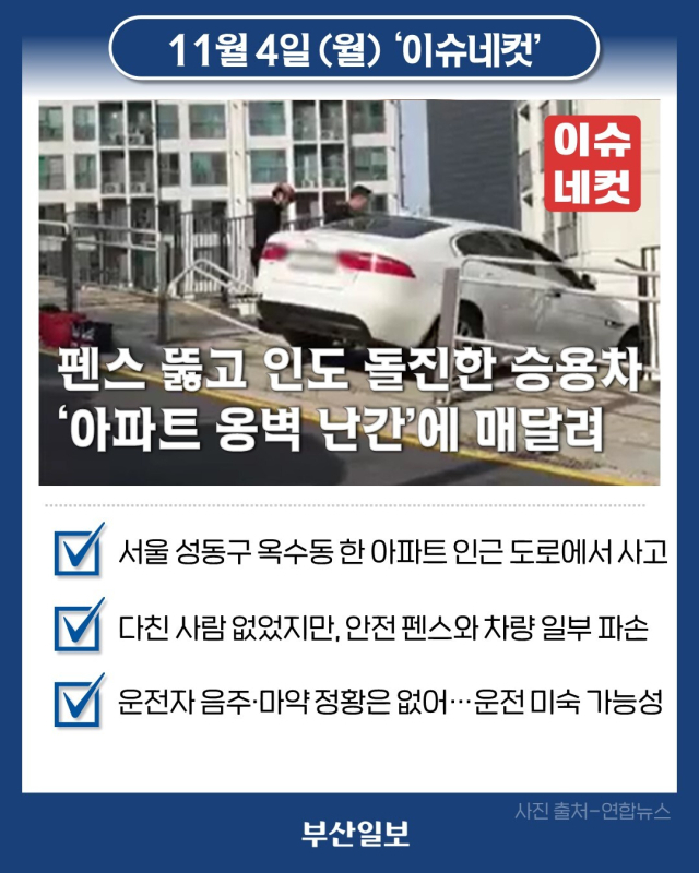 1. 펜스 뚫고 인도 돌진한 승용차…‘아파트 옹벽 난간’에 매달려