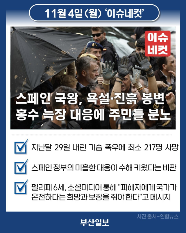 스페인에서는 지난달 29일 쏟아진 기습 폭우로 최소 217명이 사망한 것으로 집계된 가운데, 펠리페 6세 스페인 국왕과 페드로 산체스 총리가 대홍수로 큰 피해를 본 현장을 찾았다가 분노한 수재민들에게 욕설과 함께 진흙을 맞는 '봉변'을 당했습니다. 주민들이 국왕과 정부에 이처럼 분노한 것은 기상청이 폭우 '적색경보'를 발령한 때부터 지역 주민에게 긴급 재난 안전문자가 발송되기까지 10시간 넘게 걸리는 등 이번 수해가 당국의 안이한 대응 탓이라고 생각하기 때문인데요. 펠리페 6세는 이후 소셜미디어 영상을 통해 "피해 주민들의 분노와 좌절을 이해해야 한다"며 "피해자들에게 국가가 온전하다는 희망과 보장을 줘야 한다"고 밝혔습니다.