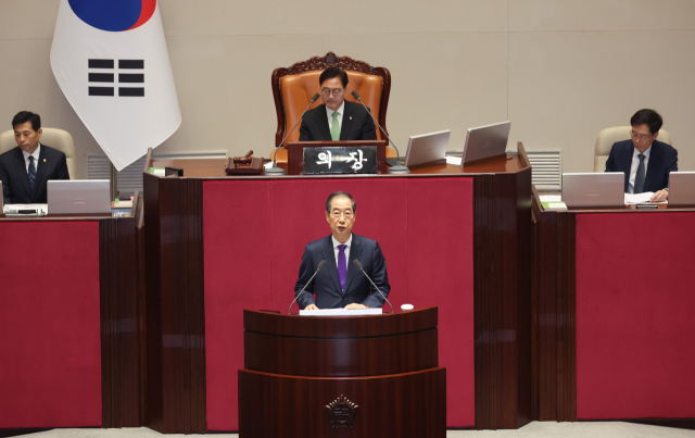 한덕수 국무총리가 4일 국회 본회의에서 2025년도 예산안에 대한 시정연설을 하고 있다. 현직 대통령이 시정연설에 불참하고 총리가 본회의장 단상에 오르는 것은 11년 만에 처음이다. 연합뉴스