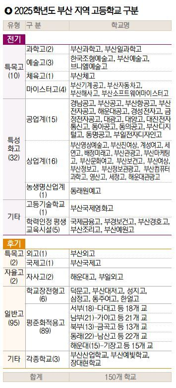 부산시교육청은 ‘전기 학교’인 과학고의 원서 접수를 마치고 전형을 진행하고 있다. 예술고와 체육고, 마이스터고(부산항공고·부산해군과학기술고) 특별전형의 경우 지난달 31일 합격자를 발표했다. 직업계열 특성화고 특별전형·일반전형은 이달 말 또는 다음 달 초 원서를 접수하고 곧장 전형을 진행해 합격자를 발표한다. ‘후기 학교’인 일반고와 외국어고, 국제고, 자사고 입학 전형은 다음 달 9일 원서 접수를 시작한다.