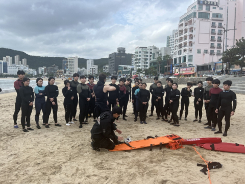 이날 훈련은 해양 사고 상황을 재현한 시나리오를 통해 학생들이 실전 환경에서 응급처치와 구조 기술을 익히도록 했다. 해양경찰교육원의 박준영 구급 교수가 개발한 이 프로그램은 해상 척추 손상 환자 구조 및 이송을 목표로 하며 학생들이 팀 단위로 다양한 응급구조 기법을 적용하고 판단력을 훈련할 수 있도록 설계됐다. 훈련에는 해양경찰교육원에서 파견된 유연재, 박준영 구급 교수와 수상안전 자격을 가진 선배들이 안전요원으로 참여해 학생들이 안전하게 다양한 기술을 실습하고 자신감을 쌓을 수 있도록 지도했다.