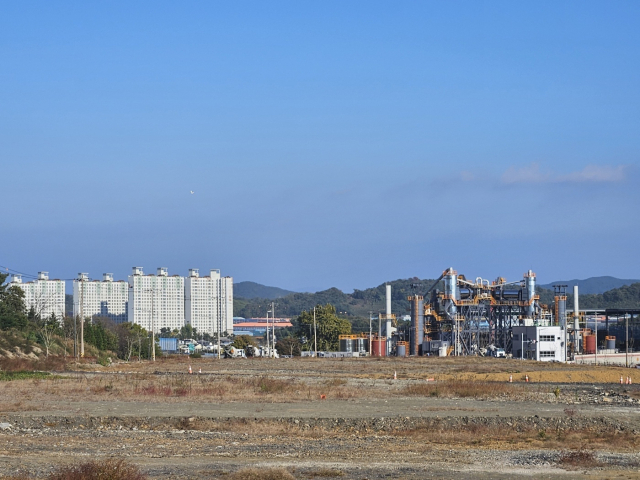경남 사천시 축동면 일반산단에 들어서는 아스콘 공장 모습. 뒤쪽으로 진주 지역 아파트 단지가 보인다. 김현우 기자