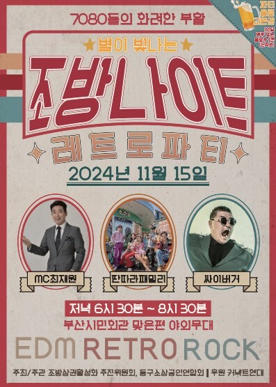 부산 동구(구청장 김진홍)는 조방의 옛 명성을 되살리기 위한 일환으로 1970~80년대의 화려했던 추억의 거리를 재현하는 축제인 ‘별이 빛나는 조방나이트(레트로파티)’ 를 오는 11월 15일 부산시민회관 맞은 편 동일타워 앞 야외 무대에서 개최한다고 밝혔다.