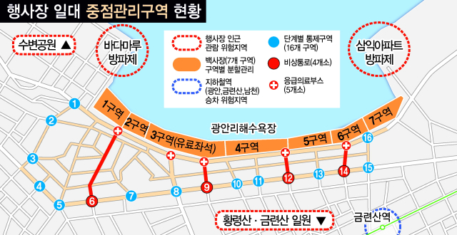본 행사 때는 인파 밀집으로 인한 사고가 주의된다. 광안리해수욕장 일대가 도로가 좁고 상업 시설이 많기 때문이다. 시는 광안리해수욕장과 해변로 일대에 인파 총량제를 적용해 수용 인원 20만 명이 초과하면 출입을 전면 통제한다. ㎡당 3명 이하로 안전기준을 강화하고, 백사장~해변로~광남로로 연결되는 비상통로 4곳도 확보한다.