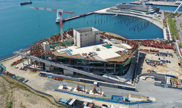2026년 준공 예정인 부산 북항 재개발 구역 내 부산 오페라하우스 건설 현장. 이곳에서도 ‘똥떼기 관행’이 확인돼 부산지방고용노동청이 조사에 나섰다. 정종회 기자 jjh@