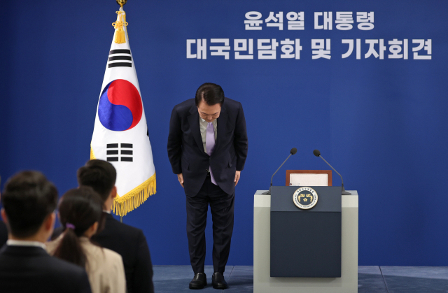 윤석열 대통령이 7일 서울 용산 대통령실 청사 브리핑실에서 열린 ‘대국민 담화 및 기자회견’에서 국민들에게 사과하며 고개 숙여 인사하고 있다 연합뉴스