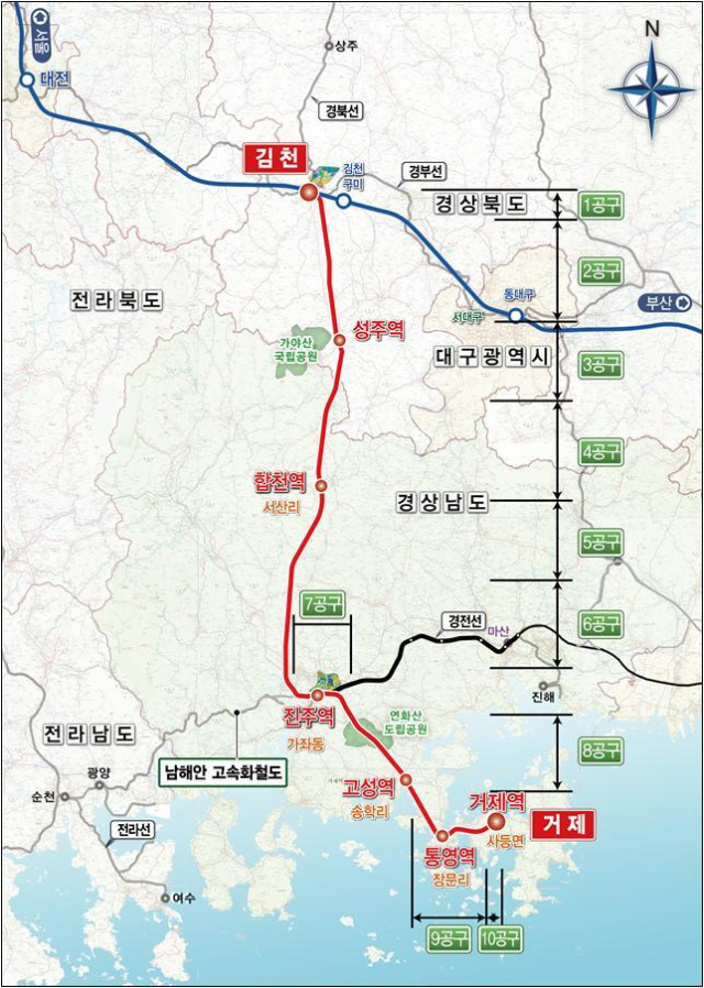 남부내륙철도는 경북 김천시·성주군·고령군, 경남 합천군·산청군·진주시·고성군·통영시·거제시 등 경남과 경북 9개 시군을 지난다.