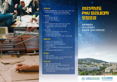 부산대학교(총장 최재원) 미래시민교육원은 성인 느린학습자를 대상으로 문화예술중심 평생교육을 시행하는 'PNU 미리내대학'의 2025학년도 신입생을 모집한다.
