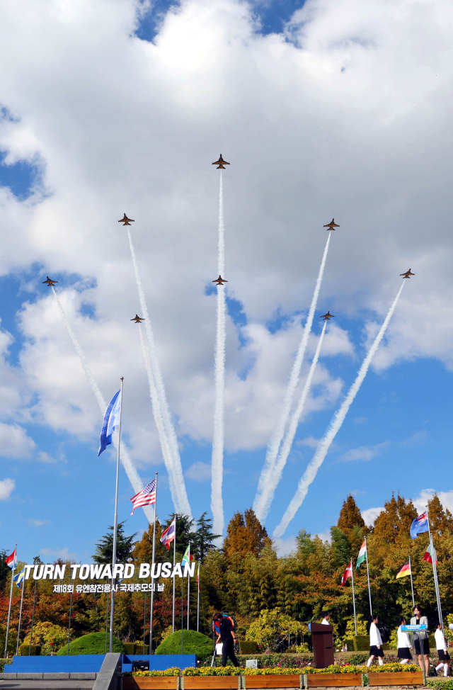 11일 부산 남구 유엔기념공원에서 열린 ‘턴 투워드 부산(Turn Toward Busan) 제18회 유엔참전용사 국제추모의 날 기념식’에서 공군 블랙이글스가 추모 비행을 하고 있다. 11월 11일 오전 11시 세계 유일의 유엔묘지가 있는 유엔기념공원에서 전몰 용사들을 향해 1분간 묵념하는 것을 골자로 한 이번 행사는 2007년 캐나다 참전용사 빈센트 커트니 씨의 제안으로 시작됐다.