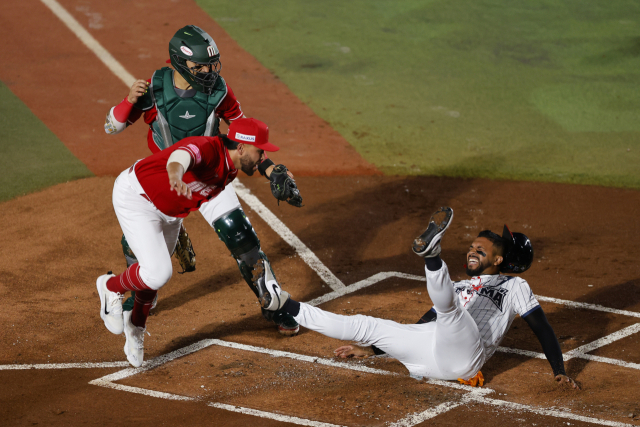 12일(한국시간) 멕시코에서 열린 WBSC 프리미어12 A조, 멕시코와 파나마의 경기에서 파나마의 조시완 라이트(오른쪽)가 슬라이딩하며 홈을 지나고 있다. 이날 파나마는 멕시코를 3-2로 물리쳤다. EPA연합뉴스