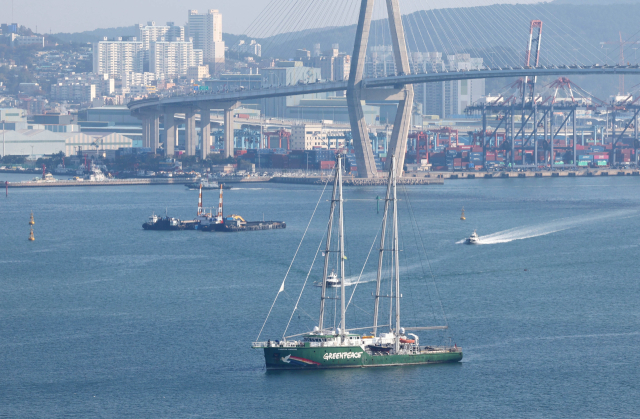 국제 환경단체 그린피스의 상징인 환경감시선 ‘레인보우 워리어호’(855t)가 12일 부산항 북항에 정박해 있다. 이 배는 25일부터 부산에서 열리는 국제 플라스틱 협약 제5차 정부 간 협상위원회(INC-5) 회의를 앞두고 실효성 있는 협약을 촉구하기 위해 8년 만에 부산을 찾았다.