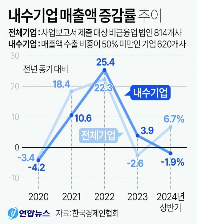 하지만 이런 증가세는 수출기업(194개사)의 매출액이 13.6% 증가한 데 따른 것이다. 나머지 내수기업(620개사)의 매출액은 전년 동기보다 1.9% 감소했다. 2020년(-4.2%) 이후 전년 동기 대비 매출액이 감소한 것은 4년 만이다.