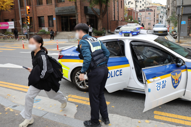 2025학년도 대학수학능력시험(수능)이 치러진 14일 서울 마포구 홍익대학교사범대학부속여자고등학교에서 한 수험생이 경찰차에서 내려 시험장으로 향하고 있다. 연합뉴스