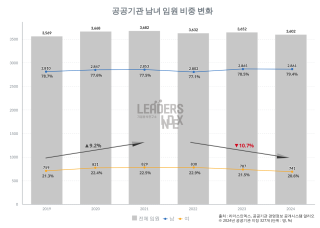 아울러 2022~2024년 공기업과 공공기관의 여성 상임기관장도 30명(전체에서 여성 기관장 비중 9.4%)에서 22명(8.0%)으로 감소한 것으로 집계됐다. 여성 기관장 22명 중 20명은 기타 공공기관 소속이었다.