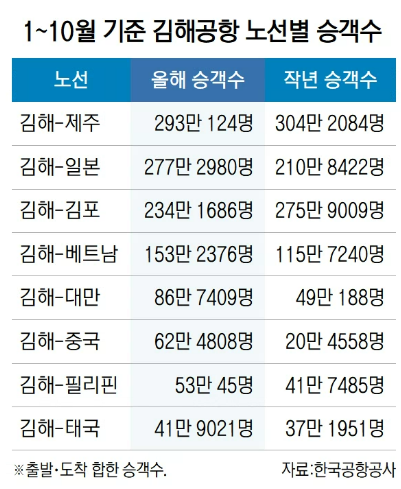 이어 올해는 김해~베트남 노선이 153만 명을 기록하면서 지난해 동기보다 32.4% 증가했고 김해~대만 노선은 87만 명으로 77.0%, 김해~중국 노선은 62만 명으로 205.5% 각각 급증했다.