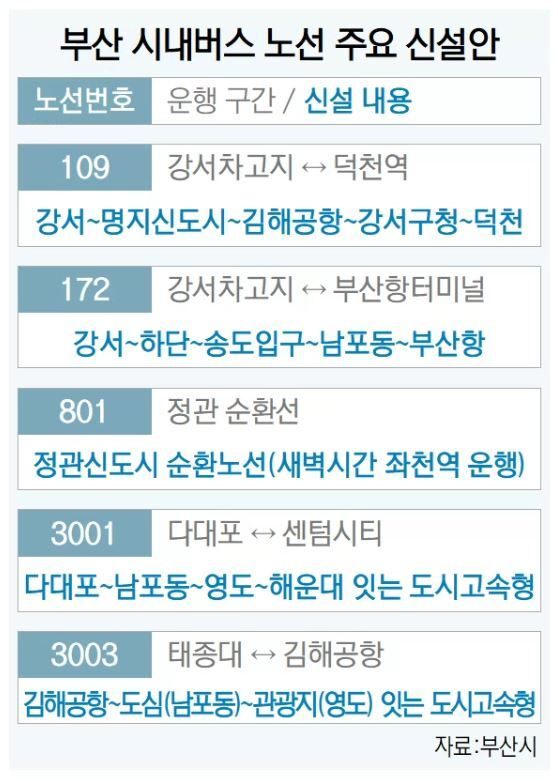 이번 1단계 시내버스 노선 조정안은 △기장·강서 지역 시내버스 배차 간격 평균 6분 단축(부산시 전체는 2분 단축) △도심과 외곽을 연결하는 도시고속형 버스 확대 도입 △신도시 신규 노선 공급, 정관신도시 내부 순환선 도입 △기장 오시리아, 강서에 수요응답형 교통(DRT) 확대 도입을 골자로 한다.