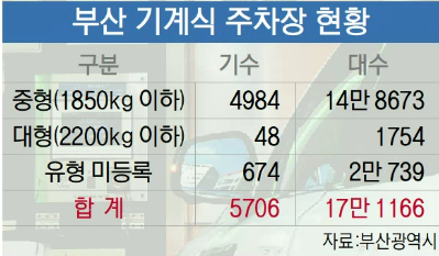 17일 부산시 등에 따르면 지난달 기준 부산 지역 기계식 주차장 5706기 중 대형 기계식 주차장(2200kg 이하 차량 주차 가능)은 48기로, 전체의 0.8%에 불과하다. 중형 기계식 주차장(1850kg 이하 차량 주차 가능)은 4984기이며, 나머지 674기는 유형이 등록되어 있지 않은 주차장이다. 전국적으로 살펴보더라도 2023년 말 기준 기계식 주차장 3만 6764기 중 429기(1.2%)만이 대형 주차장이다.