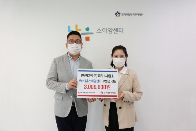 한전KPS(주) 고리1사업소(소장 김은식)는 최근 국백혈병어린이재단(이사장 오연천) 부산나음소아암센터를 방문해 소아암 어린이를 위한 후원금 300만 원을 전달했다.