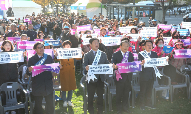 동남권관문공항추진위원회와 미래사회를 준비하는 시민공감 등 시민단체들이 18일 부산 부산진구 송상현 광장에서 '지역항공사 존치를 위한 범시민결의대회'를 개최했다. 이번 결의대회는 가덕신공항 성공을 위한 지역거점항공사 확보와 에어부산 분리매각을 촉구하기 위해 마련됐다.