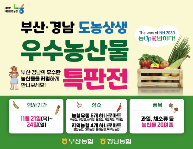 부산농협은 오는 21일부터 24일까지 나흘간 부산지역 하나로마트에서 부산·경남 우수농산물 특판전 ‘The way of NH 2030 농up! 愛 반하다(포스터)’를 개최한다고 18일 밝혔다.