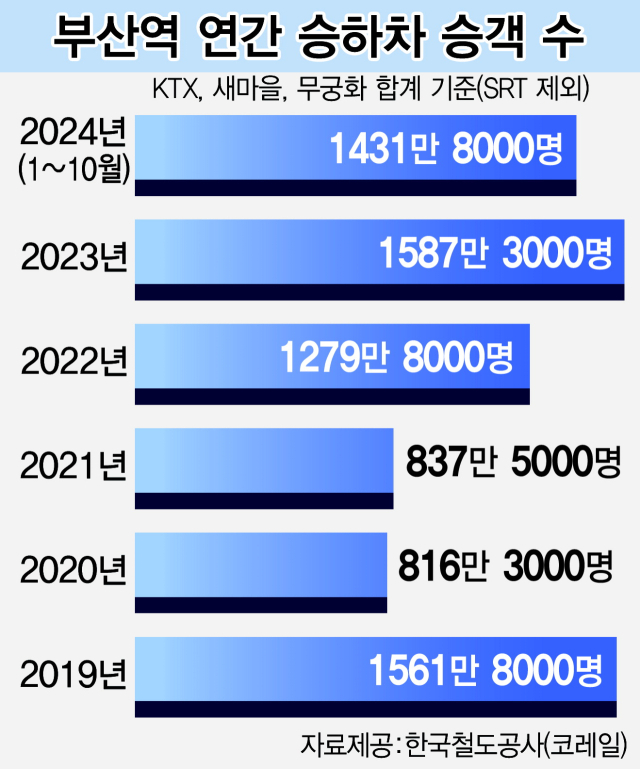 부산역에 승하차하는 열차 승객은 꾸준히 늘었다. KTX와 새마을호 등 코레일 열차와 SR이 운영하는 SRT 승객을 더하면 2021년 1262만 1617명, 2022년 1849만 1927명, 2023년 2202만 6875명으로 집계됐다.