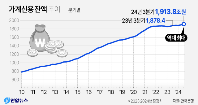한국은행이 19일 발표한 ‘2024년 3분기 가계신용(잠정)’ 통계에 따르면 9월 말 기준 가계신용 잔액은 1913조 8000억 원으로 집계됐다. 2분기 말(1895조 8000억 원)보다 18조 원 많을 뿐 아니라, 2002년 4분기 관련 통계 공표 이래 가장 큰 규모다.