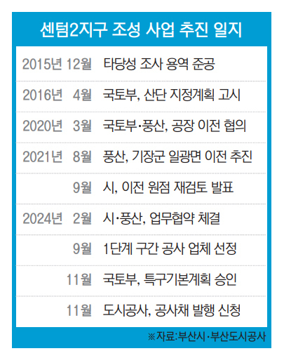 이후에도 2년 넘게 표류하던 풍산 이전 문제와 센텀2지구 조성 사업은 올 2월 새로운 전기를 맞는 듯했다. 시와 도시공사, 풍산이 공장 이전을 위한 양해각서(MOU)를 체결하면서 문제 해결이 속도를 낼 것으로 기대를 모았기 때문이다.