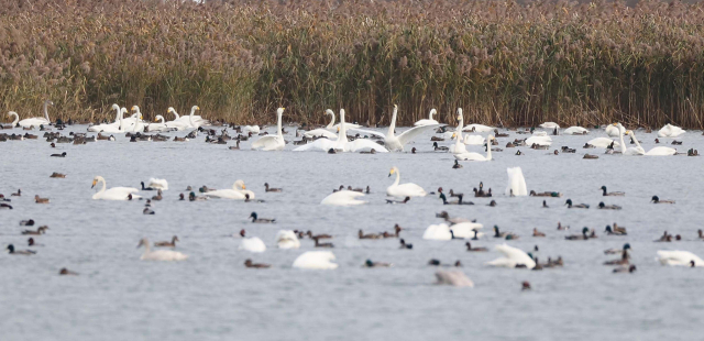 겨울철새 고니(일명 백조, 천연기념물 제201호) 무리가 19일 부산 낙동강 하구 명지갯벌에서 먹이를 찾으며 겨울을 날 준비를 하고 있다. 부산 을숙도와 명지갯벌 등 낙동강 하구에는 고니와 청둥오리 등 많은 겨울철새들이 찾아들고 있다.