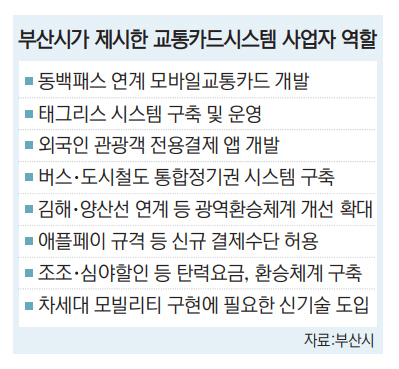 부산시가 1997년 현재의 교통카드 시스템이 구축된 후 27년 만에 새 사업자 공모에 나선 것은 첨단 모빌리티 서비스를 전면 도입해 시민들의 대중교통 이용 편의를 높이겠다는 취지다. 교통카드 시스템 운영에 경쟁 체제를 도입함으로써 대중교통 시스템의 혁신을 이끌어내고, 수송분담률을 높여 부산을 스마트 대중교통 친화도시로 만들겠다는 목표다.