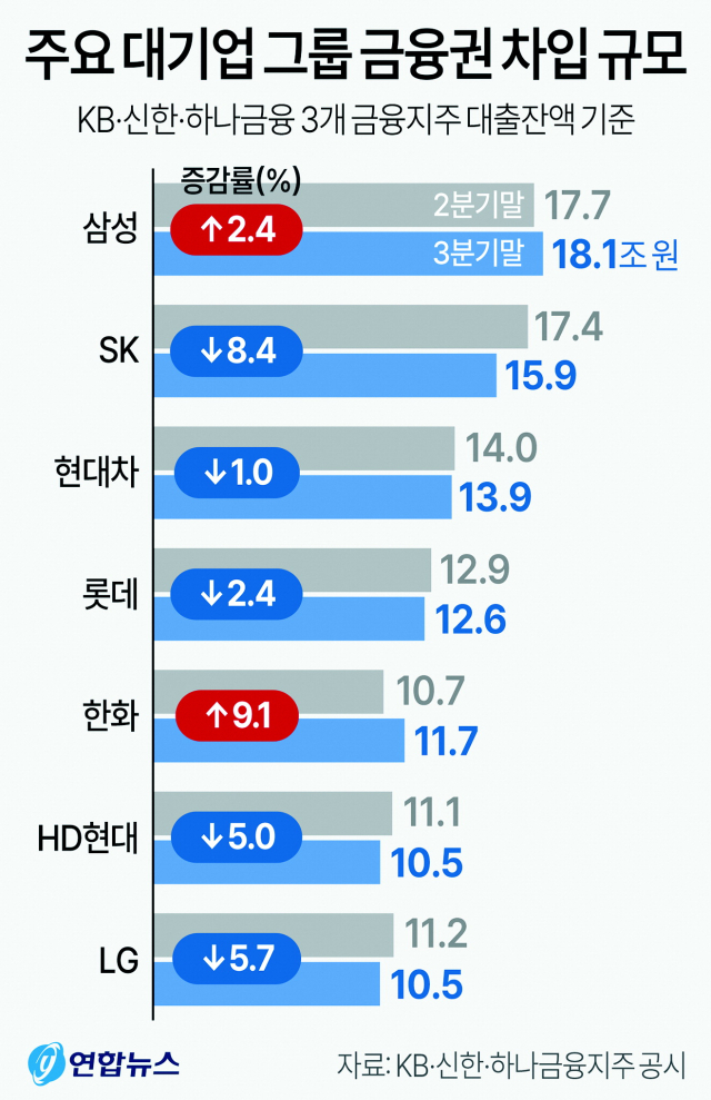 다만 삼성과 한화 그룹은 대출이 늘었는데, 삼성은 외화 대출을 중심으로 여유 자금을 확보했고 한화는 방산과 조선 등 자금 수요가 큰 사업에 집중하면서 대출이 증가한 것으로 보인다.
