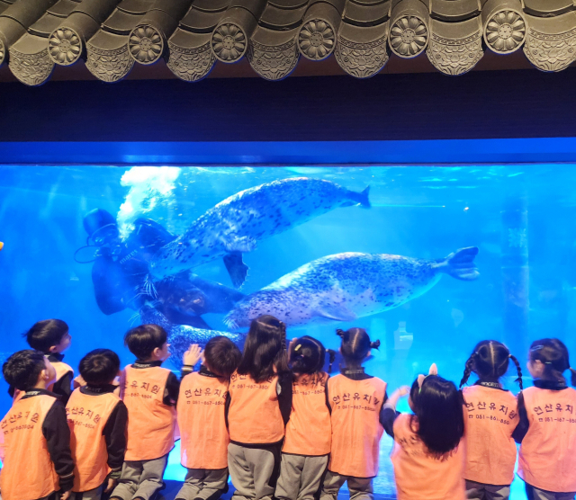 부산 아쿠아리움은 20일부터 내년 4월까지 물범 4마리를 전시한다고 밝혔다. 부산에서 물범 전시는 15년 만이다. 20일 오전 아쿠아리스트가 유치원생 앞에서 물범에게 먹이를 주고 있다. 씨라이프 부산 제공