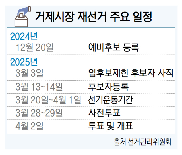 21일 중앙선거관리위원회에 따르면 박 전 시장 궐위에 따라 2025년 4월 2일 거제시장 재선거가 치러진다. 관할 선관위는 12월 20일부터 예비후보 등록을 받는다. 이어 내년 3월 13‧14일 후보 등록에 이어 20일부터 선거운동을 시작해 28‧29일 사전투표를 한다. 당선인 임기는 2026년 6월 30일까지다.