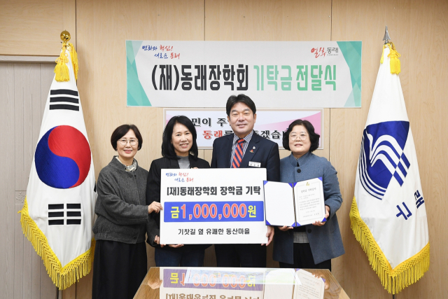 부산 동래구 낙민동 기찻길 옆 유쾌한 동산마을(위원장 박정애)은 지난 19일 (재)동래장학회(회장 조홍래)에 장학금 100만 원을 기탁했다.