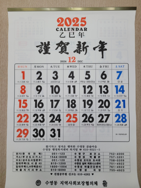 부산광역시 수영구 수영동 행정복지센터(동장 강두리)는 지난 11월 19일 수영동 지역사회보장협의체(위원장 서진태)의 주관으로, 다가오는 새해를 맞아 내방 민원 및 가정방문 대상자에게 전달할 2025년도 복지 달력을 제작했다고 밝혔다.
