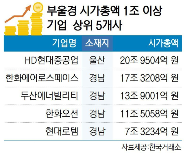 한편, 부울경에서 올해 1분기 시총 1조 원을 넘긴 상장사는 모두 15곳으로 나타났다. 부산이 4곳, 울산이 2곳, 경남이 9곳이었다. 지난 20일 기준 HD현대중공업(울산)이 20조 9504억 원으로 시총 1위를 차지했고 △한화에어로스페이스(경남) 17조 3208억 원 △두산에너빌리티(경남) 13조 9001억 원 △한화오션(경남) 11조 5058억 원 △현대로템(경남) 7조 3234억 원순으로 나타났다.