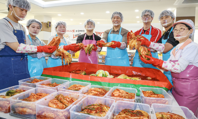 21일 부산 영도구 국립한국해양대학교에서 열린 ‘온기 담은 김장김치 나누기’ 행사에서 류동근 한국해양대 총장과 교직원, 학생들이 김치를 담그고 있다. 이날 담근 김장김치는 지역 취약계층 400세대에 전달될 예정이다.