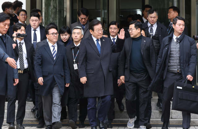 더불어민주당 이재명 대표가 25일 오후 서울 서초구 서울중앙지법에서 열린 '위증교사' 혐의 사건 1심 선고공판에서 무죄선고를 받은 뒤 법원을 나오며 지지자들에게 손을 흔들고 있다. 연합뉴스
