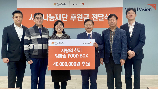 (재)서원나눔(이사장 강수자)은 지난 25일 사회복지법인 월드비전 부산사업본부(본부장 이현)를 통해 ‘엄마손 푸드박스 season2’ 후원금 4000만 원을 전달했다.