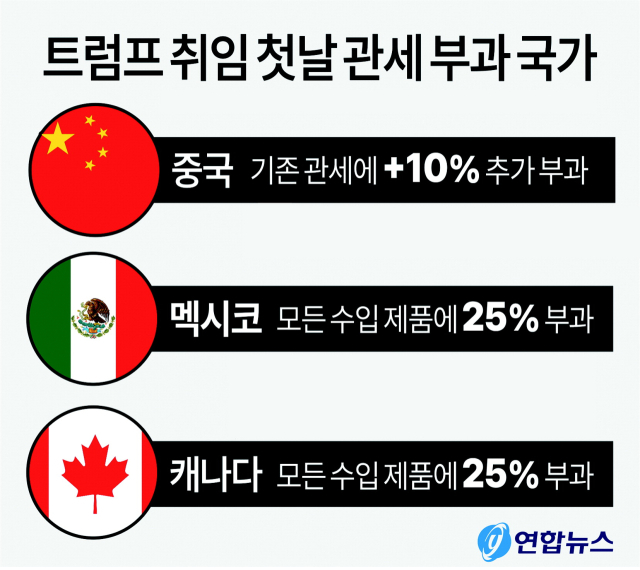 트럼프 당선인은 25일(현지시간) 마약 유입과 불법 이민 문제 대응을 이유로 내년 1월 20일 취임하자마자 멕시코와 캐나다에 각각 25%의 관세를 부과하고, 중국에 대해서는 추가 관세에 더해 10%의 관세를 더 부과할 것이라고 밝혔다. 미국과 자유무역협정(미국·멕시코·캐나다협정, USMCA)을 맺은 멕시코와 캐나다 등 동맹국도 ‘관세 폭탄’의 대상이 된 것이다.