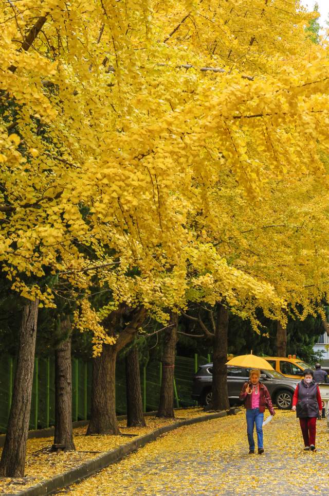 겨울을 재촉하는 비가 내린 26일 부산 사상구 학장동 은행나무길에서 우산을 쓴 시민이 지나가고 있다. 27일 경남 내륙 일부 지역에는 눈이 내리고 초겨울 추위가 찾아올 전망이다.