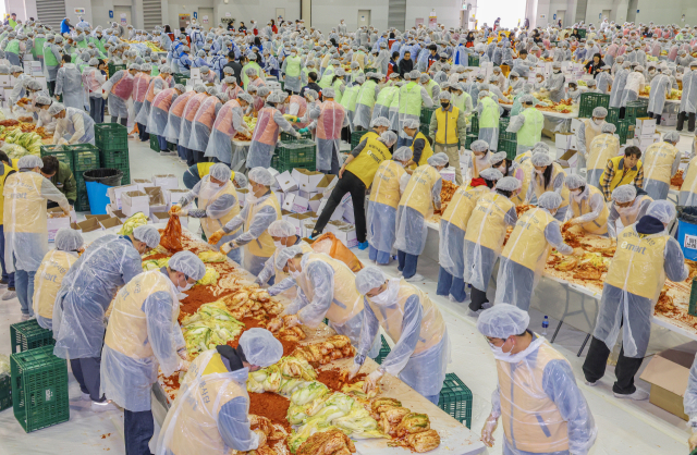 ‘2024 사랑의 김치나눔 한마당 행사’가 27일 오전 부산 해운대구 벡스코 제2전시장에서 열려 37개 후원 기업과 기관, 자원봉사단체에서 온 1000여 명의 봉사자들이 김장을 하고 있다. 이날 행사에서 담근 김치 1만 1000포기는 홀몸노인 등 지역의 소외계층 5500여 세대에 5kg씩 전달될 예정이다.