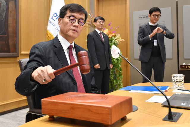 이창용 한국은행 총재가 28일 서울 중구 한국은행에서 열린 금융통화위원회에서 의사봉을 두드리고 있다. 연합뉴스