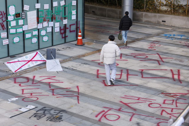 서울 성북구 동덕여대 백주년 기념관 앞이 남녀공학 전환 반대 래커칠로 가득한 모습. 연합뉴스