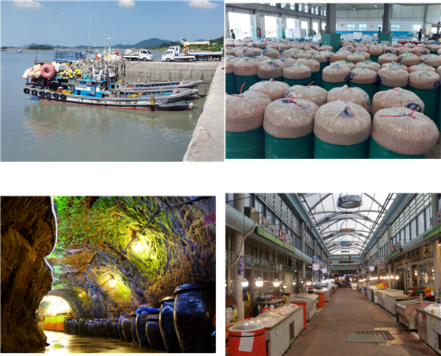 ‘광천 토굴새우젓 가공업’. (좌측 상단부터 시계방향) 젓새우 어획 어선, 젓새우 위판장, 광천토굴새우젓 숙성·발효 제조 과정. 해수부 제공
