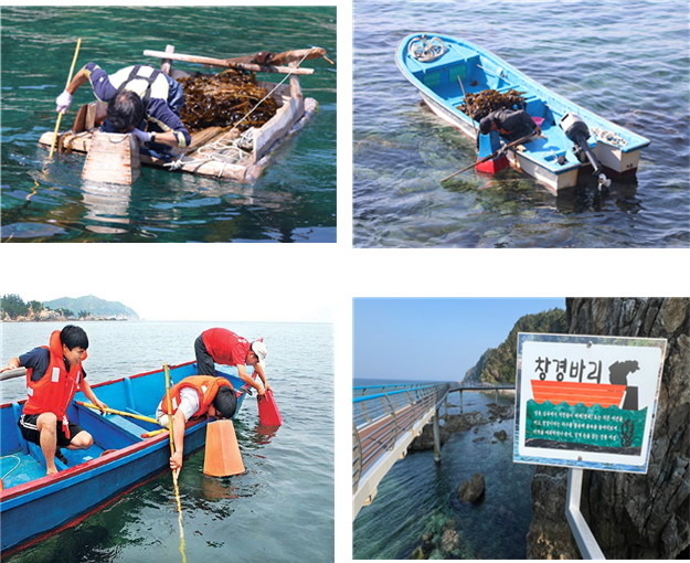 ‘강릉 창경바리어업’. (좌측 상단부터 시계방향) 떼배를 이용한 창경바리어업, 전마선을 이용한 창경바리어업, 정동·심곡 바다부채길(창경바리어업 주조업구역), 심곡어촌체험휴양마을 창경바리 체험 프로그램. 해수부 제공
