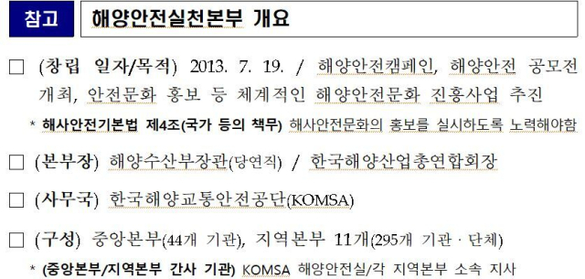 강도형 해수부 장관은 이번 안전 캠페인과 관련, “민관이 함께 전국적인 해양안전 캠페인을 전개함으로써, 선사·선박 종사자의 안전의식을 제고하고 익숙함과 부주의에 의한 사고를 예방하고자 한다”고 활동의 취지를 설명하며 시민들의 협조를 당부했다.